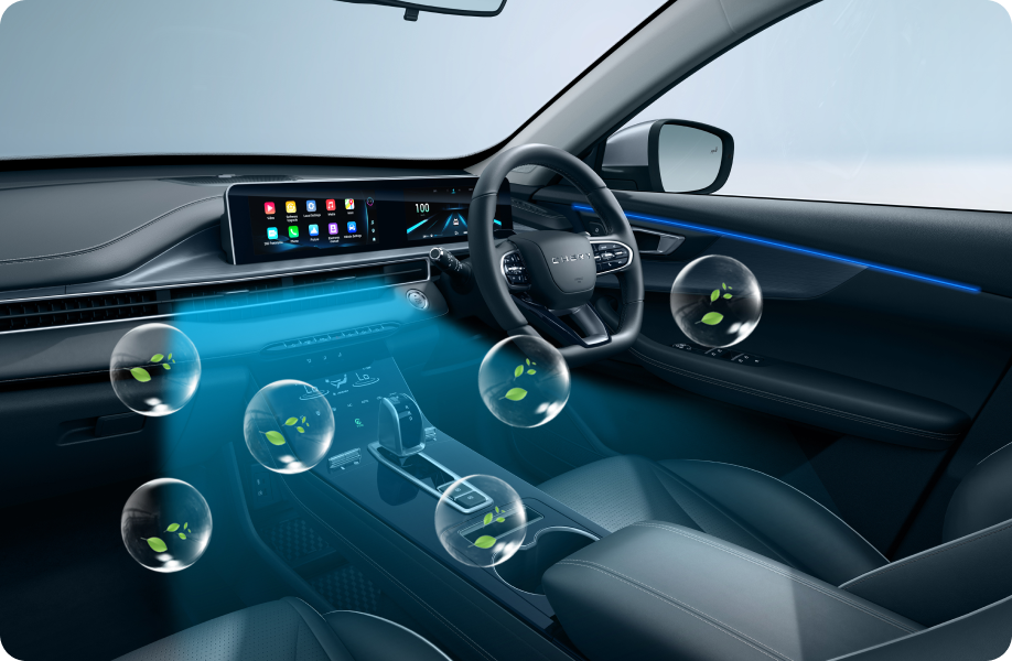 - Dashboard berlapis soft-touch leather dengan ambient light.